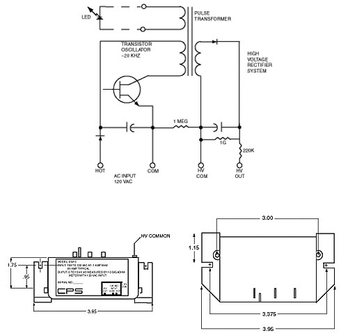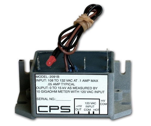 The Model 2091B unregulated solid state power supply is designed for ionizers, medium duty electronic air cleaners, and laser start-up EOS/ESD antistatic equipment. The 2091B is available with either positive or negative output. Standard 2091 units are 6 kVDC, 12 kVDC, or 25 kVDC output; other output voltages are available. Call CPS for further information regarding customization options for the 2091 Series. SPECIFICATIONS