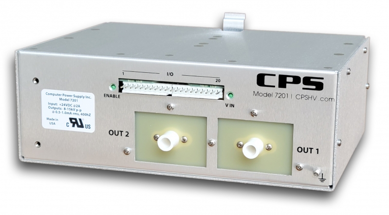 Outputs2 synchchronized HV outputs are available. Output 1 is permitted to float to the DC bias of the corona discharge device. Output 2 forces balanced positive and negative voltages with respect to ground. In addition, a clock signal is provided on the connector to allow two 7201 units to be synchronized with a 180 degree phase shift. ControlBoth outputs are current-controlled independently with separate analog program signals . A program voltage of 2.5 VDC to 5.0 VDC provides linear proportional adjustment of the output current from 500uA up to 1mA RMS MeteringThe 7201 provides Voltage monitor signals for each output. A monitor value of up to 8VDC is directly proportional to the average absolute peak voltage. SPECIFICATIONS